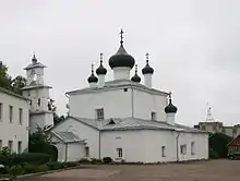 L'église est surmontée de cinq dômes. L'historien russe Ivan Zabeline a étudié le site. Il constate que c'est le premier type d'église dont les dômes ne sont pas placés dans les angles des coins, mais du côté des points cardinaux. Sur les tambours du dôme central existaient de petites fenêtres, qui ont été murées après la révolution d', quand le bâtiment a été transformé en entrepôt. Les tambours des autres dômes sont aveugles, longs, et étendent leurs pieds jusqu'aux corniches. La toiture était recouverte de tuiles à l'origine. Actuellement sa couverture est en métal. Comme beaucoup d'églises de Pskov, elle est précédée du clocher-arcade et d'un porche. Le carré central des bâtiments est entouré de papertes qui permettent d'agrandir la surface disponible par temps froids ou de pluie.