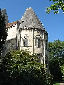 L'église Saint-Nicolas n'est pas encore surmontée de son clocher du XVe siècle mais la tour Sud est déjà plus haute et a quelques similitudes avec celle de l'abbatiale de la Trinité de l'abbaye aux Dames, ce qui confirme que la façade romane n'a jamais été terminée et que la tour Nord est restée dans l'état où elle est aujourd'hui[9].