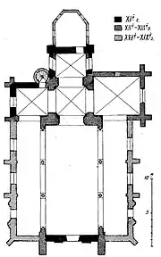 Pierre Héliot précise que les murailles grossières du soubassement du chœur, de la chapelle nord et de la façade ouest sont du XIe siècle. À cette époque, l'église devait avoir du chœur à chevet plat, une nef, probablement un transept et de bas-côtés. Il déduit la présence de bas-côtés par l'existence de contreforts plats sur la façade du XIe siècle. Le chœur et le transept ont dû être repris dans le troisième quart du XIIe siècle. Les voûtes, leurs supports, les arcatures aveugles du sanctuaire et les deux premiers étages du clocher semblent dater de cette période. le clocher est achevé à la fin du XIIe siècle. La chapelle sud a été érigée vers 1200, en même temps qu'on relevait la nef élargie, ses bas-côtés et la façade occidentale. La nef et les bas-côtés sont remaniés au XVe siècle ou au XVIe siècle. Ils son presque entièrement reconstruits entre 1702 (date sur le pignon du collatéral sud) et 1705 (date sur un pignon du collatéral nord). La sacristie a été construite en 1699. C'est probablement à cette occasion que la tourelle d'escalier a été refaite.