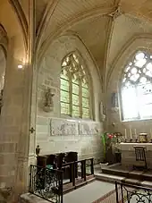 L'abside est tout à fait homogène avec la croisée du transept. Pour une superficie équivalente, elle se contente d'une seule voûte. La clé de voûte est un découpage flamboyant, dont le motif est un quadrilobe servant de support à un écusson aux armes de la famille de Guiry : d'argent aux trois quintefeuilles de sable[13]. Les lobes prennent la forme de soufflets. Aux quatre extrémités, figurent des fleurons. À part la clé de voûte, le décor architectural proprement dit est absent du chœur, à l'exception toutefois d'une minuscule niche double taillée dans un bloc de pierre unique, qui est encastrée dans le mur méridional. Le principal ornement du chœur sont les réseaux particulièrement riches des fenêtres, qui sont à trois lancettes et toutes les trois différentes dans leur partie supérieure. Au sud, on y trouve deux paires de soufflets dissymétriques affrontés, surmontés de trois petits soufflets, et flanqués d'étroites mouchettes. Au chevet, se répète le dessin de la fenêtre occidentale du croisillon sud. Il est assez conventionnel, et présente trois soufflets symétriques et d'étroites mouchettes. La fenêtre septentrionale combine des particularités de la fenêtre méridionale de droite du croisillon sud, et de la fenêtre méridionale de la troisième travée de la nef, à savoir des losanges entre les têtes tréflées des lancettes, et deux soufflets superposés accolés. Ce motif central de la partie haute du réseau est flanqué de deux autres soufflets. Il est à signaler que la fenêtre orientale conserve des fragments de vitraux de la limite XVe / XVIe siècle. Ils sont classés monument historique au titre objet depuis 1975. Il s'agit de cinq petits anges musiciens, de la tête d'un personnage non identifié, et de bordures peintes au jaune d'argent, ainsi que deux fois du monogramme IHS. Ces fragments ont été montés dans une vitrerie blanche moderne en 1957[14].