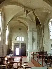 La nef est lumineuse, car éclairée directement par de hautes fenêtres, contrairement à la plupart des nefs flamboyantes de la région, qui sont flanquées de bas-côtés et aveugles. Depuis l'extérieur, les hauts murs gouttereaux suggèrent un certain élancement, ce qui n'est pas l'impression obtenue à l'intérieur de la nef. En effet, son importante largeur fait descendre les voûtes assez bas : leur retombée s'effectue à un tiers de la hauteur des fenêtres. En plus, les arcs-doubleaux n'adoptent pas un tracé aigu et pourraient s'inscrire dans des hémicycles. Les voûtes paraissent donc surbaissées, ce qui est fréquent à la période flamboyante. Enfin, le sol de l'église a été exhaussé, puis abaissé au niveau initial lors d'une restauration entreprise par le Service des monuments historiques dans l'après-guerre[n 4], mais seulement jusqu'au début de la seconde travée. Ensuite il faut gravir quatre marches d'escalier. La partie antérieure de la nef ne peut donc accueillir de bancs de fidèles, et sert de vestibule. La première travée est de toute façon plus étroite que les suivantes, car elle est en partie occupée par la base du clocher. La pile sud-est du clocher se situe à l'intérieur de l'église. Elle est de plan carré, et assez volumineuse. Chaque face est décorée de deux pilastres, qui encadrent une niche à statue. Tout en haut, les pilastres affichent un décor du goût de la Renaissance, avec un rang de feuilles stylisées, un rang d'oves et un rang de postes. Suivent quelques bandeaux à faible profil, qui sont susceptibles de résulter d'une restauration. Contrairement à ce que l'on pourrait attendre, les trois arcades et doubleaux partant de la pile du clocher sont à peine plus larges que des doubleaux habituels. La voûte de la base du clocher est percée d'un trou pour la montée des cloches. Dans les angles nord-ouest et nord-est, ses nervures retombent sur un haut tailloir de plan triangulaire, sans angle saillant. Les tailloirs sont pourvus de multiples moulures, et reposent sur des chapiteaux corinthiens fantaisistes. L'unique face de la corbeille présente deux fois deux volutes, comme s'il s'agissait de deux faces. L'on trouve la même disposition dans l'extrémité sud-ouest de la nef. Ce n'est qu'à la retombée de l'arcade entre première travée et base du clocher que le tailloir est rectangulaire, et que la corbeille du chapiteau adopte une forme normale. Les fûts sont en segment de cercle, et pas tout à fait propres à la Renaissance[5],[13].