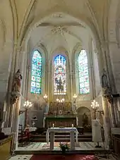 L'abside comporte une partie droite et un chevet à trois pans, tous les pans étant de largeur identique. La travée s'ouvre par un doubleau à simple rouleau, qui n'est pas mouluré et seulement chanfreiné. Sous cet angle, il est encore plus simple que les trois autres doubleaux qui entourent la croisée du transept. C'est cependant le seul dont les tailloirs reposent sur des chapiteaux. À l'instar de ceux qui supportent la voûte de la croisée, ils sont sculptés de feuilles plates toutes simples, mais ils sont plus grands, et le diamètre des fûts est également plus important. Il est flanqué par les fûts des ogives de la croisée et de l'abside, placés en retrait. Chaque pan de l'abside est ajouré d'une grande baie en tiers-point sans remplage, qui occupe presque toute la largeur des murs et se rapprochent de près des formerets, que l'abside est la seule travée de l'église à posséder. Comme les baies des croisillons, les fenêtres de l'abside prennent appui sur un long glacis pentu, et comme à l'est des croisillons et sous le triplet au sud, le soubassement représente un tiers de la hauteur sous le sommet de la voûte. Une niche en anse de panier est ménagée dans le pan sud-est, et une piscine liturgique entourée de moulures prismatiques, mais néanmoins en plein cintre, subsiste au sud. Les supports de la voûte méritent d'être signalés, car leur disposition fait preuve d'une certaine recherche stylistique. Les chapiteaux des formerets sont implantés nettement au-dessus des autres, à côté des impostes des fenêtres, ce qui évite à la fois des arcs surhaussés comportant des sections verticales, et permet aux formerets de servir de même temps de décor aux fenêtres. Les ogives sont du même profil que dans les croisillons. La clé de voûte, refaite, est le seul élément flamboyant à l'intérieur de l'abside, et assez remarquable. Il comporte une section centrale qui est pendante, et flanquée de quatre consoles, et des découpages flamboyants. Six accolades forment une sorte d'étoile, et s'amortissent alternativement par un fleuron ou une fleur de lys ; elles sont reliées les unes aux autres par des arcs festonnés[3].