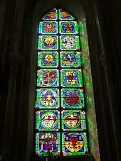 Le vitrail oriental de la chapelle de la Vierge est dédié aux litanies de la Vierge. « Ave Maria » et l'année 1859 sont inscrits au sommet. La mission et la dignité de Marie, ses qualités et ses vertus, sont exprimées par « Mère très pure » . Sont nommés ensuite les titres symboliques par lesquels on célèbre ses louanges depuis le XVIe siècle au moins : « rose du mystère, vase admirable, miroir de justice, tour de David, maison d'or, porte du Ciel, arche d'Alliance, étoile du matin ». Enfin, la grandeur de la Vierge est célébrée par les titres de « reine des Anges ». Par manque de place, les autres titres ne peuvent pas y figurer. Le vitrail qui occupe l'emplacement analogue dans le croisillon sud date de la même année et est conçu dans le même esprit, tant sur le plan du dessin général, qui est le même (sauf pour le contenu des médaillons), que dans le fond, car les vertus et qualités de saint Nicolas y sont listées à la façon d'une litanie : « sa dignité, son autorité, sa piété, sa charité, sa prudence, sa simplicité, ses miracles, sa protection », ainsi que sur un autre registre sortant de cette logique, « ses victoires, sa récompense ». Pour venir à la grande verrière du croisillon nord, face à la verrière du Rosaire, elle est de six années plus tardive (1857), mais reprend le même ordonnancement, et figure également un arbre au centre, en l'occurrence un pied de vigne portant des grappes de raisin. La vigne représente Jésus, et les grappes le fruit de son passage sur terre, sa parole mise en œuvre par les Apôtres auxquels le vitrail est dédié : « Je suis la vraie vigne, et mon Père est le vigneron […]. Je suis la vigne, vous êtes les sarments » (cf. Bible Crampon 1923/Jean 15,1 et 5). Les Douze Apôtres, en réalité treize avec Judas Iscariote, sont ici complétés par les deux Évangélistes qui ne sont pas Apôtres : saint Pierre, saint Jacques le Majeur, saint Thomas, saint Philippe, saint Barthélémy, saint Matthias, saint Matthieu, saint Marc, saint Paul, saint André, saint Jacques le Mineur, saint Simon, saint Jude, saint Luc, saint Jean. Saint Matthieu n'est pas représenté par son attribut habituel, l'homme ailé, mais un pupitre, en référence à son métier de publicain[12].