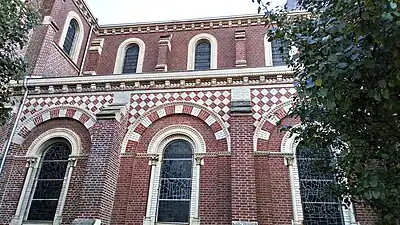 L'église de Rosières a été construite en brique en style néo-roman. Son plan est celui d'une croix latine avec nef à bas-côtés, transept et chœur. Une tour-clocher flanque la façade du côté sud de la nef; il est coiffé d'une flèche recouverte d'ardoises. Le porche d'entrée est surmonté d'une rosace.