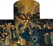 Sous le clocher se dresse le mémorial des morts de la guerre 1914-1918. Ce mémorial, inauguré le , comporte deux tableaux sur toile peints[12] par Jacques-Émile Blanche, autre Offranvillais, symbolisant le retour du corps d'un héros « Mort pour la France ». La foule est rassemblée à la porte de l'ancien cimetière, sous l'éternelle verdeur de l'if ; l'abbé Genty, curé doyen, récite les prières devant la bière drapée aux couleurs nationales alors que, dans un grand rayon de lumière, l'Ange de la Gloire, entouré d'angelots descend déposer la palme de l'héroïsme. Toutes les personnes peintes sur le tableau appartiennent aux familles qui ont perdu un membre de leur famille durant la guerre 1914-1918.