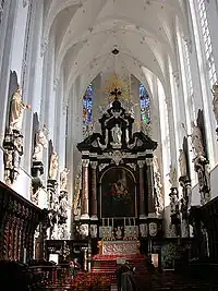 Quand les calvinistes s'emparent du pouvoir à Anvers en 1578, ils en expulsent les dominicains et toutes les congrégations. L'église est transformée en temple protestant et l'intérieur est dépouillé de toute son ornementation. Le transept et le chœur sont en partie démolis. Le couvent sert de fonderie de canons. Lorsque les troupes du duc de Parme assiègent la ville en 1584 pour défendre les droits de la couronne d'Espagne, les habitants se servent des pierres de certaines parties de l'édifice, comme le transept et le chœur, pour les utiliser comme ballast dans des bateaux de feu qui sont lancés contre le pont construit sur l'Escaut par les assiégeants. Après la défaite des calvinistes en 1585, les dominicains retrouvent leur possession et font restaurer et redécorer l'église et le couvent. La partie la plus importante de la reconstruction s'effectue entre 1605 et 1616. L'ensemble est terminé en 1662. La première pierre du chœur agrandi et du nouveau transept est bénite en 1618. Au cours des décennies suivantes, l'intérieur est entièrement décoré en style baroque. Pieter Verbrugghen l'Ancien (en) et son atelier réalisent les confessionnaux, les boiseries et les stalles de chêne entre 1658 et 1660[4]. Il réalise aussi le coffrage de l'orgue en 1654 et les dessins du maître-autel avec son fils Pieter Verbrugghen le Jeune (en) en 1670[5]. Il est consacré par Mgr Capello d'Anvers.