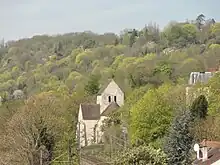 Elle est bâtie à l'écart du village, à flanc du coteau qui descend du massif de l'Hautil, au sud du château qui la domine, parallèlement à la ligne de Paris-Saint-Lazare à Mantes-Station par Conflans-Sainte-Honorine.