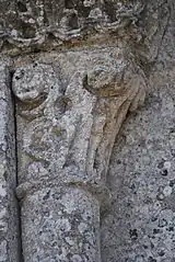 Les voussures du portail sont encore telles que les décrit Léo Drouyn en 1855[5], sauf la première, refaite en 1862 en dents de scie. Les six chapiteaux du portail sont de facture fruste. Cinq ont une décoration à feuillages (feuilles d'eau ou de palmettes renversées). Le sixième chapiteau, sur l'ébrasement nord, est une composition animalière : une bête bicorporée, à tête unique. Les deux corps, aux queues entrelacées, sont disposés dos-à-dos pour dessiner un oméga (Ω) majuscule.