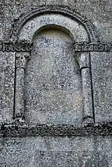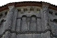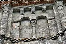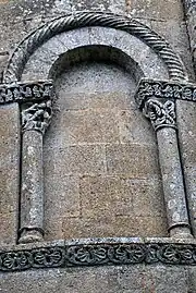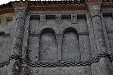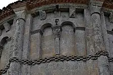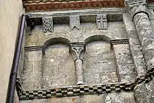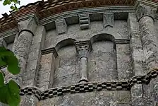 Les neuf arcatures aveugles doubles ont toutes un chapiteau central sculpté avec un décor végétal.