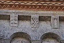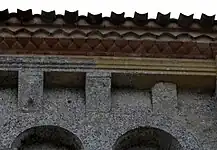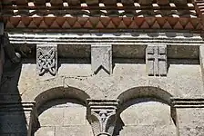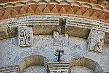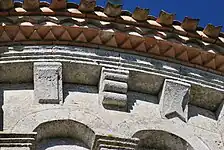 Dans chaque pan, la corniche est supportée par trois modillons. Au total, 23 modillons sont sculptés avec des figures géométriques, entrelacs, damier, etc. quatre étant abimés ou lisses. Il n'y a aucun modillon figuré. Cette série de modillons est plus tardive que la série qui orne la façade occidentale.