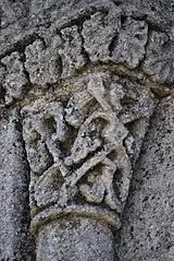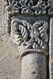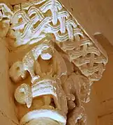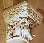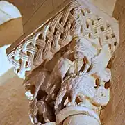L'ornementation du tailloir associe des entrelacs nattés sur les deux côtés et des alvéoles sur la face principale.