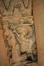 Sur la corbeille du chapiteau sud, un mammifère (un lion ou un loup) est montré de profil, sa longue queue dessinant une boucle. Il est opposé à deux serpents. Le premier serpent commence par enlacer la queue du lion, puis descend sur son flanc et se tourne pour happer sa cuisse gauche. Le second serpent, quant à lui, mord la patte avant droite de l'animal, alors que ce dernier vient de lui saisir le cou entre ses canines.