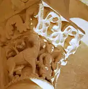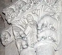 Les lions se sont superposés, comme les dragons du chapiteau no 2. La crainte leur a rabattu les oreilles et leurs gueules sont fermées, conformément au récit biblique (Livre de Daniel, chapitre VI, verset 23).