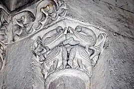 Les deux chapiteaux qui encadrent la fenêtre axiale de l'abside sont également des exemples d'animaux superposés.