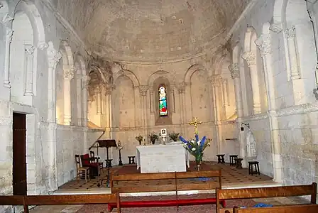 Autour du sanctuaire, se trouve une arcature avec douze colonnes qui portent des chapiteaux sculptés. Sept de ces chapiteaux sont historiés, dont six sont romans, les autres portent un décor végétal ou géométrique. Les deux chapiteaux de l'arc triomphal portent un décor végétal. Les baies des cinq fenêtres ont des chapiteaux sculptés et, seule, la baie axiale est ornée de chapiteaux historiés.