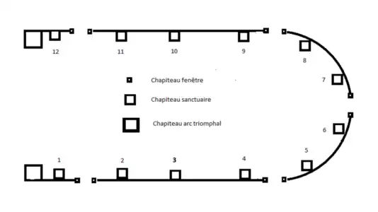 Les deux chapiteaux de l'arc triomphal portent un décor végétal, ainsi que les chapiteaux nos 5, 11 et 12 du sanctuaire.
