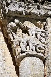 Sur le chapiteau sud, sont affrontés deux quadrupèdes, à bec d'oiseau et à cou torsadé, sur les croupes desquels sont perchés deux oiseaux. Les queues des bêtes sont sexualisées et forment des panaches feuillus qui s'entrelacent sur l'angle de la corbeille. L'un des oiseaux est en train de béqueter une feuille qu'il a cueillie et l'autre en train de picoter une feuille encore fixée à l'une des queues.