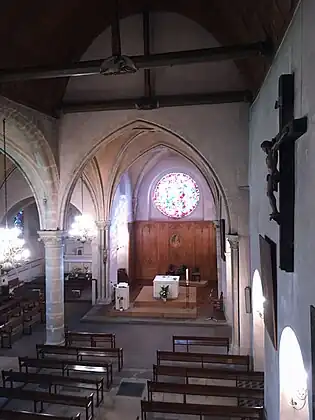 L'église possède une nef centrale qui est séparée du bas-côté sud par une série d'arcade en plein centre de style roman et du collatéral nord par des colonnes monumentales de style gothique supportant des voûtes d'ogives. Le pavement de la nef est actuellement en très mauvais état et se compose d'un conglomérat de dalles calcaires brisées et de chapes de ciment et béton. La nef est surmontée par une voûte en berceau de bois renforcée par quatre entraits datant de 1575. Ces entraits portent différentes sculptures en rond-bosse polychromes dont, pour l'entrait près du porche d'entrée, les armes de Charles IX.