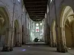 La nef composée de trois vaisseaux de quatre travées a été érigée à partir de 1550. Elle comporte une élévation à deux niveaux de grandes arcades en arcs brisés qui reposent sur des piliers et des colonnes adossées dotés de simples chapiteaux doriques. Le vaisseau central est couvert d'une charpente apparente, les bas-côtés sont voûtés sur croisées d'ogives ornées de clés de voûte. Une clé est sculptée d'un Agnus Dei, sur une autre sont représentées des clés, symboles de saint Pierre.