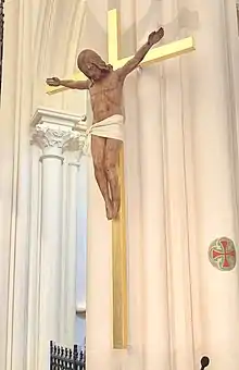 Le dimanche , une nouvelle croix installée à l'entrée du choeur, côté nord, a été bénie au cours de la messe dominicale, en présence de l'artiste-sculpteur, Alain Savariau, qui a travaillé sur cette œuvre pendant deux années. Le Christ nu est réalisé dans une poutre provenant d'une restauration au Mont-Saint-Michel. Jésus est recouvert au niveau du bassin par l’écharpe personnelle de l'artiste qui l'a nouée autour de la taille, constituant ainsi le Saint Pagne fait d'une fine étoffe blanche, légère et translucide. La croix en bois est entièrement dorée, ce qui prête vie à l’ensemble, tandis que les poignets de Jésus ne reposent pas sur elle, donnant ainsi une impression de légèreté de son corps entier comme s'élançant vers une élévation céleste.