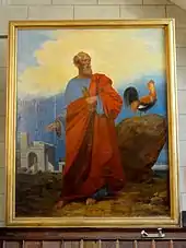 - Le tableau représentant le Reniement de saint Pierre mesure 200 cm de largeur pour 200 cm de hauteur, et date du XIXe siècle. L'Apôtre se tient debout, et porte déjà une clé dans une main. Son attitude paraît hésitante. À droite de lui, l'on voit un rocher sur lequel se tient un coq (« Avant que le coq chante, tu m'auras renié trois fois » — Lc 22,34, Mt 26,34), et au fond à gauche, quelques bâtiments d'une ville[16].