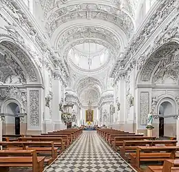 La décoration intérieures est confiée par les pères augustins à des architectes italiens, comme le tessinois Pietro Perti ou le romain Giovanni Maria Galli. Pac se fait inhumer dans l’église, dont l’intérieur n’est pas encore achevé, en 1682 avec cette inscription sur sa pierre tombale : Hic jacet peccator[2].