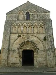 La façade occidentale, de style saintongeais, est composée de trois étages enserrés entre des contreforts plats surmontés d'un pignon.