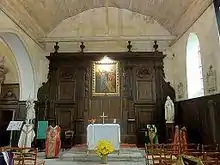 - Au chevet du collatéral, le retable de la Vierge est flanqué de boiseries, qui englobent les deux portes de la sacristie, et des panneaux sculptés d'un vase et de guirlandes.