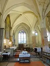 Orientée irrégulièrement vers le sud-est du côté du chevet, l'église répond à un plan symétrique mais se compose de deux parties bien distinctes. La nef ne compte que deux travées, et est bordée de bas-côtés qui portent bien leur nom. Cette partie de l'église est inachevée et très sombre. Elle est dans les faits sans usage, sauf pour les portails latéraux dans la deuxième travée des bas-côtés ; pour la sacristie aménagée dans la première travée du bas-côté nord ; et pour les fonts baptismaux dans la première travée du bas-côté sud. En effet, le chœur-halle de trois fois trois travées offre largement assez de place pour tous les fidèles. Cette partie de l'église est d'un style raffiné, élevée et lumineuse. Elle se compose de trois vaisseaux parallèles, qui ont la même largeur et sont voûtés à la même hauteur. La première travée de chacun des vaisseaux est peu profond, et la première travée du vaisseau central sert de base au clocher. Ces trois travées se substituent au transept roman. Le chœur liturgique commence symboliquement par la poutre de gloire à l'entrée de la seconde travée du vaisseau central, mais il est aujourd'hui limité à la dernière travée. En raison de leur largeur importante, les collatéraux abritent un grand nombre de bancs de fidèles. Au chevet, trois hauts retables se côtoient.