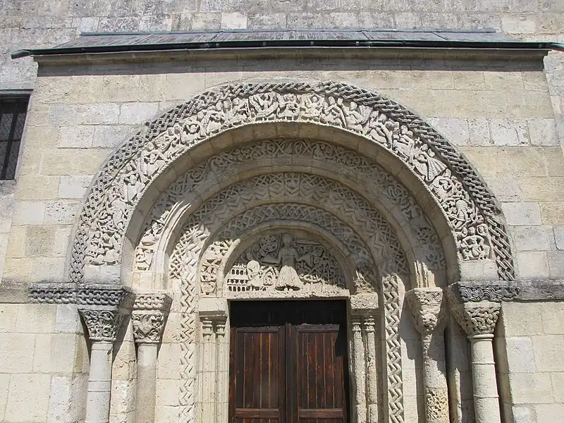 Le portail est un superbe exemple de sculpture romane parfaitement conservée. Il a été réalisé entre 1110 et 1130. Le décor luxuriant, une quadruple archivolte décorée d'entrelacs et de motifs variés, entoure un tympan orné d'une scène de l'Apocalypse et rappelle la Saintonge voisine.