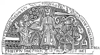 - la partie extérieure de la voussure extérieure est décorée avec une chaîne formée de losanges. La partie intérieure est décorée avec une série de figures humaines. À gauche, deux hommes vêtus de tuniques longues ; l'un des hommes a transpercé la tête d'un lion ou d'un monstre avec une lance, l'autre homme est dans un cartouche formé d'une tige qui se poursuit dans les autres voussoirs ; ensuite un griffon ou un aigle d'inspiration orientale emmêlé dans des lianes, suivi par les six apôtres animés d'un mouvement violent « encordés »[3] représentés d'une manière pictographique, tenant pour la plupart le Livre ou un objet entre ses mains. Au centre de la voussure, le Christ debout et bénissant, sa tête encadrée dans une mandorle, entre deux chérubins à triple paires d'ailes. En descendant vers la droite, après le chérubin, six autres apôtres, puis encore un griffon ou un aigle dans des lianes et, pour terminer, une Vierge à l'Enfant (?).