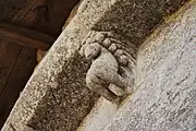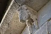 Sur la face principale, celle visible de la nef et des fidèles, deux molosses se disputent une tête humaine masculine grimaçant de douleur.