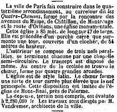 Émile Vaudremer (1829-1914), architecte de la ville de Paris, fut chargé de la construction pour laquelle il s'est librement inspiré des premières basiliques chrétiennes et d'églises romanes[3].