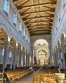 L'église est éclairée en partie haute par de grandes fenêtres et couverte non de voûtes mais d'une charpente en bois à caissons et peinte.