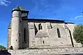 La façade de l'église soutenue par deux contreforts, flanquée d'une tour à sa droite.