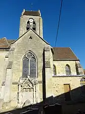 Le clocher carré du XVIe siècle est d'une facture très simple. L'étage intermédiaire est aveugle, et dépourvu de contreforts. Un bandeau mouluré souligne le début de l'étage de beffroi. Contrairement à l'étage précédent, chacun de ses angles est cantonné de deux contreforts plats orthogonaux, apparentés à des pilastres. Chacune des faces de l'étage de beffroi est percée d'une unique baie en tiers-point, qui est simplement entourée d'un ébrasement, et dépourvue de toute ornementation. Un large meneau central, qui se bifurque en Y au niveau des impostes pour rejoindre à mi-hauteur l'arc de la baie, la subdivise en deux arcades brisées. Cette disposition n'est pas favorable à l'esthétique du beffroi, et ne semble pas dater d'origine. Les murs latéraux se terminent par une discrète corniche moulurée, tandis qu'un bandeau saillant marque la naissance des pignons du côté est et du côté ouest. Les pignons sont épaulés par un contrefort plat central, qui retombe sur le bandeau. Deux orifices circulaires accompagnent le contrefort. Les rampants sont garnis de crochets, qui constituent l'unique décor sculpté flamboyants à l'extérieur de l'église. Le croisillon sud partage certains caractéristiques avec la façade, en l'occurrence l'antéfixe (d'une forme différente), le trilobe au milieu du pignon, et les larmiers des contreforts. Il n'y a pas de contrefort du côté est, et un pan de mur oblique masque la saillie de la niche d'autel. Au sud, un larmier marque la limite de l'allège. Sur le croisillon nord, un tel larmier court tout autour, en incluant les faces latérales des contreforts, conformément à l'usage à la période flamboyante. Il paraît donc que le parement extérieur du croisillon ait été entièrement refait à cette époque. Quant au chœur, il est d'une rare austérité pour l'époque de construction. Les baies sont entourées simplement d'un ébrasement, et la corniche se réduit à une tablette biseauté. Il n'y a pas de contreforts entre les fenêtres latérales. Les deux angles du chevet sont épaulés par deux contreforts orthogonaux, qui se retraitent une fois par un glacis sans larmier, et s'amortissent par un glacis formant larmier[17].