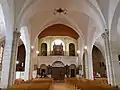L'architecture atypique de cette église s'explique par des influences stylistiques différentes, passant du baroque et du classique au néo-gothique. Formant une croix latine, l'église est composée d'une nef divisée en trois travées, couvertes de voûtes ogivales (en dehors de la première travée, couverte d'une voûte lambrissée) reposant sur des colonnes portant des chapiteaux corinthiens ou sur des piles rectangulaires, d'un transept saillant et d'une abside rectangulaire en moyen appareil. De même que la croisée, l'abside est couverte d'une charpente évoquant un navire renversé. Le mur du chevet est aveugle et orné d'un christ crucifié d'inspiration baroque.