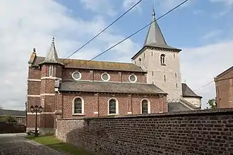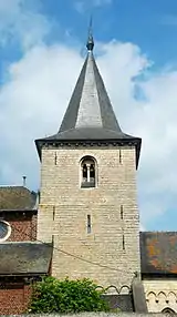 Dominant le chevet, l'église conserve un clocher roman de la seconde moitié du XIIe siècle présentant une maçonnerie faite de moellons de grès assemblés en appareil régulier. La tour est agrémentée d'arcatures romanes à sa base et de nombreuses ancres de façade en hauteur.