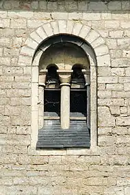 Chacune des faces du clocher est percée au dernier niveau d'une baie cintrée à double ébrasement abritant une fenêtre géminée encadrée de colonnettes à chapiteaux cubiques.