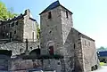 L'entrée se fait par un imposant clocher-porche couvert d'un toit en pavillon. Celui-ci abrite une seule cloche datée de 1510.