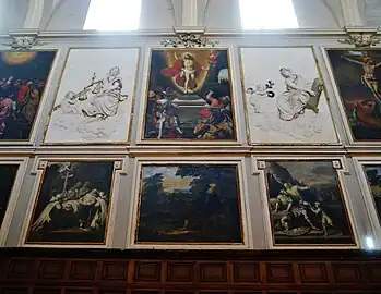 Au dessus des stalles se déroulent en deux niveaux quatre séries de représentations artistiques. Le premier niveau est partagé alternativement entre d'une part des scènes en noir et blanc de la vie de saint Bruno, fondateur de l'ordre des Chartreux, attribuées à François Fayet, et d'autre part des fresques représentant les grandes figures de l'érémitisme chrétien (saint Paul de Thèbes, saint Antoine du T, etc.). Au second niveau, les fresques représentant des scènes de la vie du Christ alternent avec des bas-reliefs en stuc qui présentent des allégories des vertus cardinales et monacales, réalisés par Pierre Lucas (père du sculpteur des anges du maître-autel). L'ajout de l'orgue et de sa tribune au XVIIIe siècle s'est fait au détriment de certains de ces panneaux aujourd'hui recouverts.