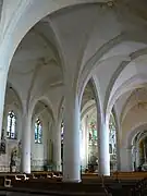 L'intérieur de la nef halle est d'un plan rectangulaire d'une dimension de 22 × 14 mètres. C'est une halle échelonnée avec une hauteur maximum de 8,10 mètres pour la nef, comportant deux collatéraux inégaux. Quatre travées et un chœur ont été construits à partir de la fin du XVe jusqu'au dernier quart du XVIe siècle. Une cinquième travée dans la même unité de style fut construite en 1862 pour son agrandissement.