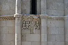 L'ensemble sculpté s'insère entre les deux colonnes-contreforts orientales et à l'aplomb de la baie axiale de l'abside. Il est composé de deux parties : un premier panneau de six personnages, avec une bordure rectangulaire, et, au-dessus, un bandeau allongé avec deux anges nimbés qui volent l'un vers l'autre.