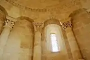 La partie orientale et la zone absidiale de l'église sont décorées majoritairement avec des palmettes, dents de scie, fruits, feuillages, pignes, etc. Cependant, il y a deux chapiteaux historiés qui représentent trois des sept péchés capitaux: Avarita, Luxuria et Libido. La décoration du chevet comporte deux étages distincts de colonnes et de pilastres, qui, pour le premier étage, ont un cordon d'entrelacs qui fait le tour de l'abside. Des sujets animés ont été sculptés dans ce bandeau, aux angles et sur les bagues contournant les fûts. Toutes ces sculptures font référence aux péchés capitaux.