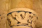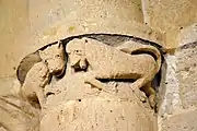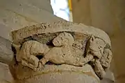 Trois personnages et un animal : Ce chapiteau est en partie englobé dans la maçonnerie du bas-côté, construit au XIVe siècle. Il est difficile d'interpréter la scène sans connaître le contenu de la représentation qui est cachée.