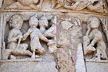 Deux modillons encadrent les sirènes : un loup mordant une longue saucisse ou un objet cylindrique et un homme nu et ithyphallique. Ils sont les témoins de la réussite de la tentation induite par les femmes-poissons.