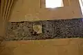 Vers le milieu du panneau, les deux failles verticales correspondent à la lumière de l'ancienne fenêtre de l'axe et une pierre brute a été utilisée pour combler la cavité et remplacer la sculpture originale. Il ne reste plus de Marie que la moitié du nimbe auréolant son visage et son coude gauche, qui devait tenir Jésus. Derrière elle, Joseph est debout, le buste incliné et la joue posée sur la paume de sa main. Il était devenu traditionnel depuis les Carolingiens de figurer Joseph des représentations de la Nativité dans cette posture stéréotypée.