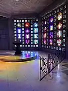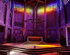 Le clocher de forme triédrique mesure 55 mètres de hauteur, il abrite trois cloches. La décoration lumineuse (vitraux)[5] du "groupe témoignage" est composée de 4000 dalles de 2,5 cm d'épaisseur découpées en 20 000 petits morceaux de cristal de Baccarat, ajustés dans le béton. L'ensemble coloré se décline en plus de 150 teintes et en fait un ensemble unique au monde. De chaque côté du chœur, deux ensembles symétriques représentent les douze Apôtres reconnaissables à leurs attributs traditionnels. Un très beau mobilier en fer forgé complète l'église : 2 bénitiers avec vasques en baccarat, le lustre, 2 grilles de séparation dans le transept, l'ambon, le tabernacle et ses dalles de cristal et le baptistère ainsi que le pied de la croix avec un christ en bois. Deux autres statues sont présentes dans les nefs latérales, saint Remy et la Vierge à l'Enfant (N.-D. de l'Offrande) de François Brochet. Pour éclairer les allées latérales, des sculptures en pierre reconstituée et cristal de Baccarat représentent les 14 stations du chemin de la croix. Un merveilleux plafond (le plus beau du genre en Europe) est composé de 130 éléments de bois collé, il pèse 19 tonnes. À l'entrée du vaisseau, en tribune sont installées les grandes orgues, instrument majestueux de Jacquot Lavergne (1958), il est composé de 3 claviers et d'un pédalier et comporte 40 registres[6]. L'ensemble sonore a 3 660 tuyaux.