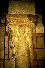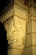 Sur chaque face du chapiteau, se trouve un « dragon ailé ». Celui de la face ouest a été martelé, il ne reste que sa silhouette. Par contre, les deux autres dragons sont complets. Celui de la face principale a la tête et la crinière d'un cheval, des écailles de poisson, la queue d'un serpent et des ailes. La créature sur la face orientale est très semblable, mais, avec sa langue fourchue, il lèche son aile. Il est accroché à l'astragale avec un pied griffu. Les trois dragons semblent plutôt jouer ensemble que combattre.