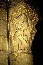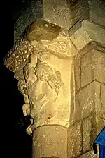 Au centre de la face principale un démon vomit peut-être des feuillages (le chapiteau a été martelé, mais compréhensible, le thème des « cracheurs de rinceaux » étant très populaire dans l'art roman). La créature encercle de ses bras deux humains, qui se trouvent sur les petites faces de la corbeille. Le personnage sur la face orientale semble être une femme nue, avec de longs cheveux. Elle tient entre ses mains un serpent. Ses pieds, comme les serres d'une rapace, agrippent l'astragale. De l'homme sur la face occidentale, il ne reste que la tête et une partie de son dos, qui est sous l'emprise du bras et la main du démon. Ses cheveux sont en tresses. Il semble que chacun ait pris dans sa bouche le « feuillage » craché par le démon.